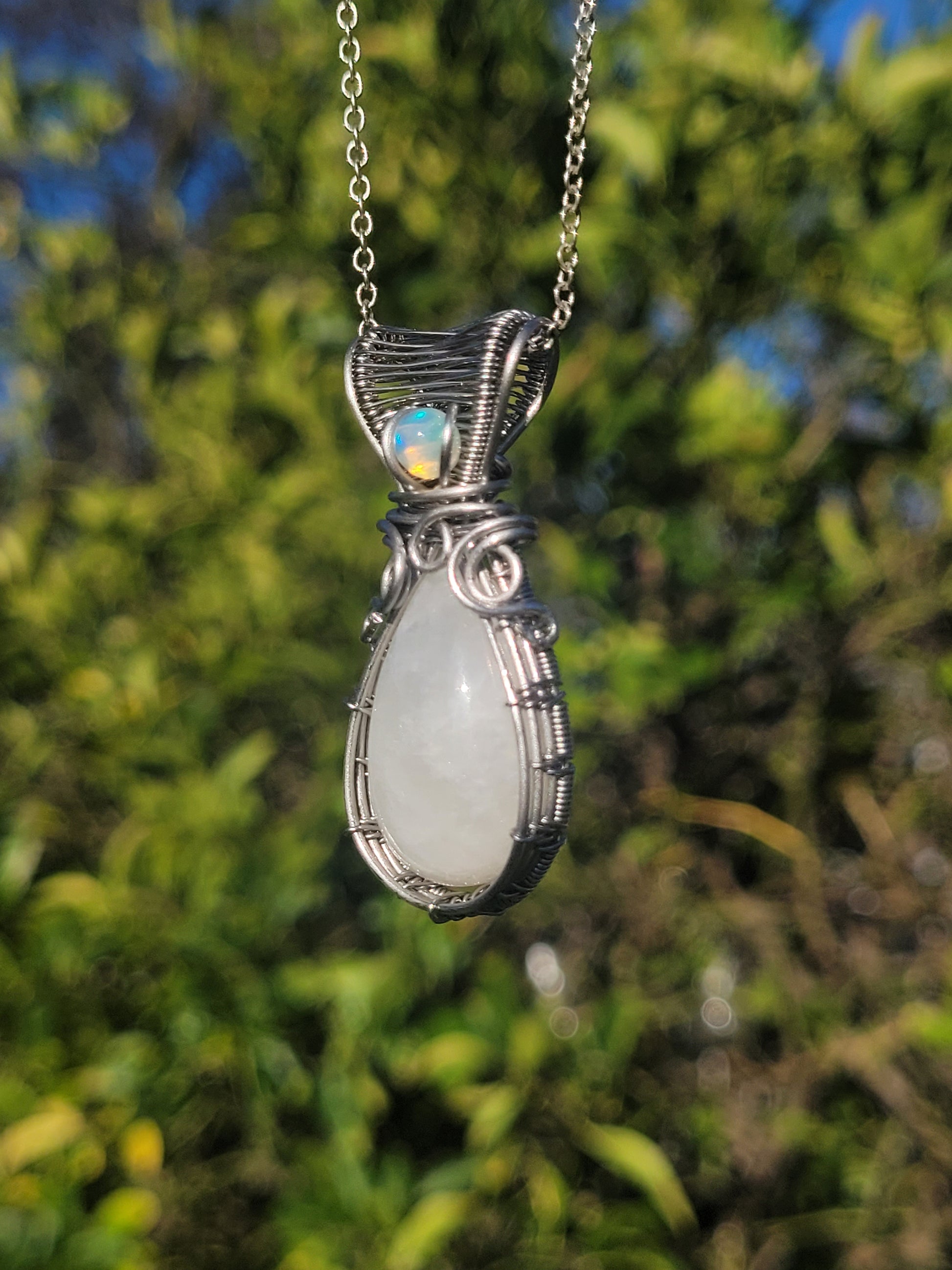 This one of a kind pendant features natural Moonstone and Ethiopian Opal, both selected for their quality and luster.